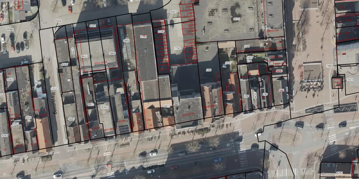Het perceel waarop Schutstraat 12-31 staat heeft een oppervlakte van 1069 m². Dit is een zeer groot perceel. De perceeloppervlakte wordt geregistreerd door het Kadaster. Gedetailleerde informatie over de maten van dit perceel kunt u vinden in het rapport Kadastrale kaart met maatvoering van Schutstraat 12-31.