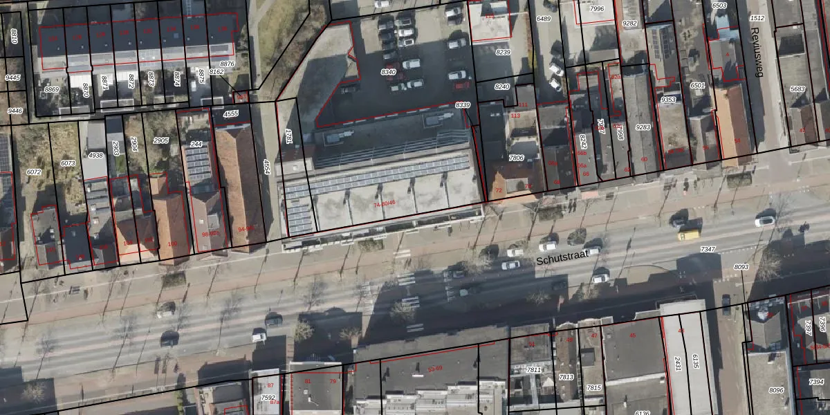 Het perceel waarop Schutstraat 76 staat heeft een oppervlakte van 2043 m². Dit is een zeer groot perceel. De perceeloppervlakte wordt geregistreerd door het Kadaster. Gedetailleerde informatie over de maten van dit perceel kunt u vinden in het rapport Kadastrale kaart met maatvoering van Schutstraat 76.