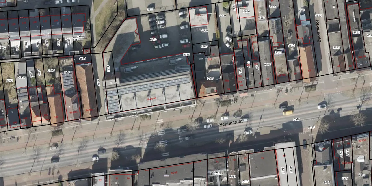 Het perceel waarop Schutstraat 80-11 staat heeft een oppervlakte van 2043 m². Dit is een zeer groot perceel. De perceeloppervlakte wordt geregistreerd door het Kadaster. Gedetailleerde informatie over de maten van dit perceel kunt u vinden in het rapport Kadastrale kaart met maatvoering van Schutstraat 80-11.