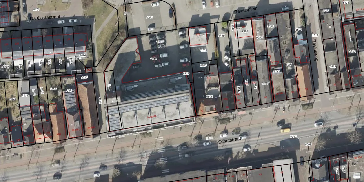 Het perceel waarop Schutstraat 80-31 staat heeft een oppervlakte van 2043 m². Dit is een zeer groot perceel. De perceeloppervlakte wordt geregistreerd door het Kadaster. Gedetailleerde informatie over de maten van dit perceel kunt u vinden in het rapport Kadastrale kaart met maatvoering van Schutstraat 80-31.