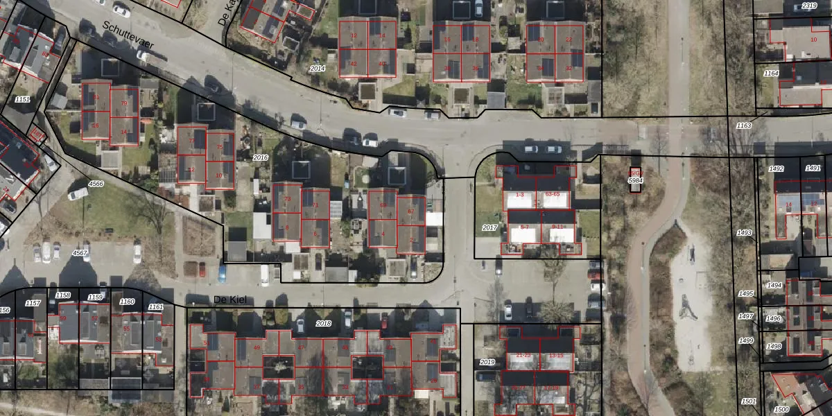 Het perceel waarop Schuttevaer 67 staat heeft een oppervlakte van 2843 m². Dit is een zeer groot perceel. De perceeloppervlakte wordt geregistreerd door het Kadaster. Gedetailleerde informatie over de maten van dit perceel kunt u vinden in het rapport Kadastrale kaart met maatvoering van Schuttevaer 67.