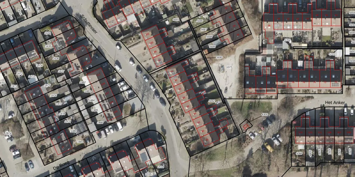 Het perceel waarop Schuttevaer 90 staat heeft een oppervlakte van 1540 m². Dit is een zeer groot perceel. De perceeloppervlakte wordt geregistreerd door het Kadaster. Gedetailleerde informatie over de maten van dit perceel kunt u vinden in het rapport Kadastrale kaart met maatvoering van Schuttevaer 90.