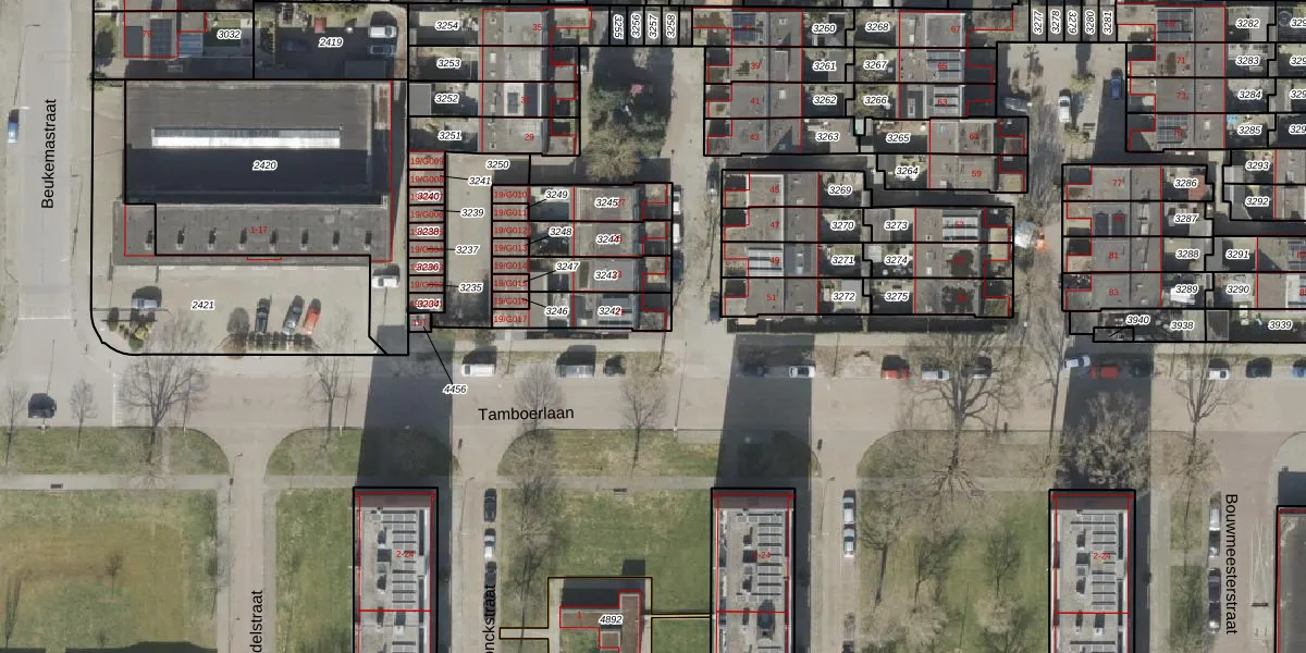 Tamboerlaan 21 is gelegen op kadastraal perceel HGV00I3242. Deze kadastrale aanduiding is uniek en wordt gebruikt door het Kadaster om eigendomsrechten en andere zakelijke rechten vast te leggen. Het perceel maakt onderdeel uit van de kadastrale gemeente Hoogeveen.