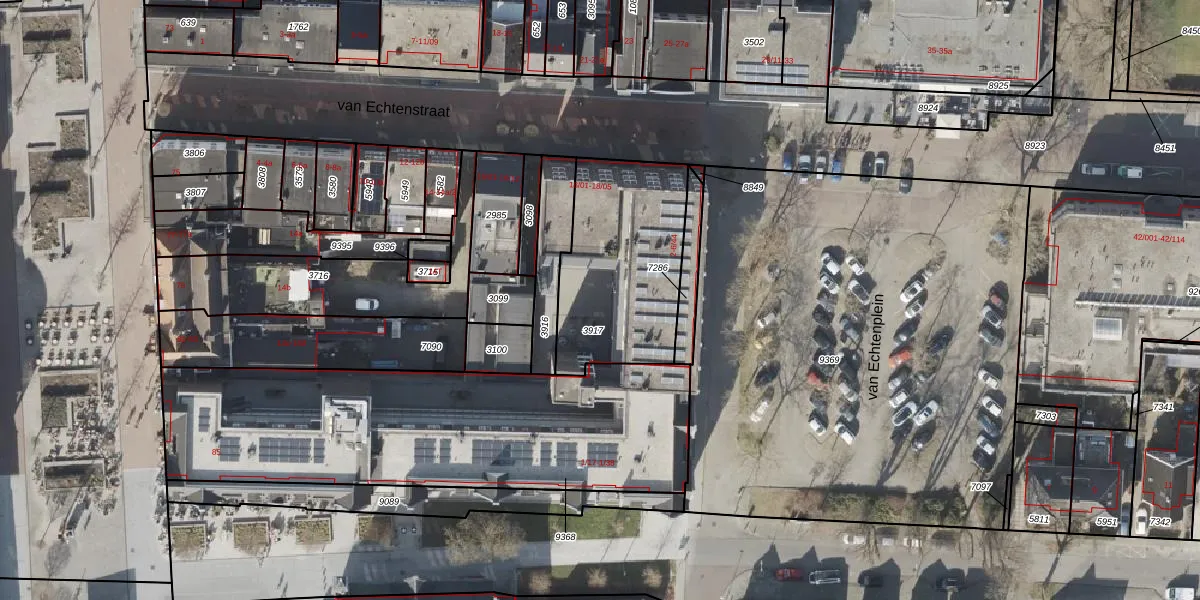 Het perceel waarop van Echtenplein 6-33 staat heeft een oppervlakte van 676 m². Dit is een groot perceel. De perceeloppervlakte wordt geregistreerd door het Kadaster. Gedetailleerde informatie over de maten van dit perceel kunt u vinden in het rapport Kadastrale kaart met maatvoering van van Echtenplein 6-33.