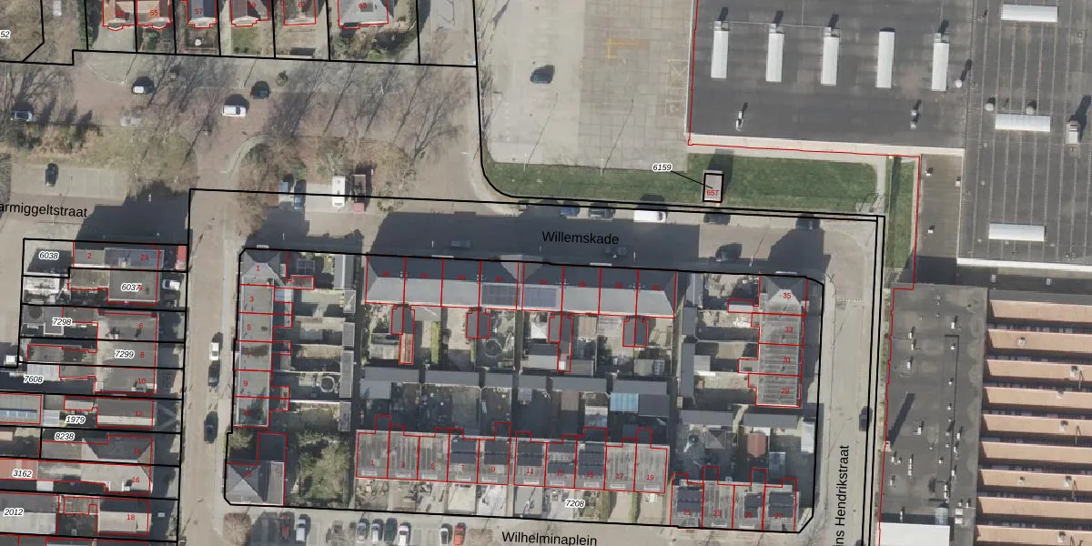 Het perceel waarop Willemskade 34 staat heeft een oppervlakte van 5017 m². Dit is een zeer groot perceel. De perceeloppervlakte wordt geregistreerd door het Kadaster. Gedetailleerde informatie over de maten van dit perceel kunt u vinden in het rapport Kadastrale kaart met maatvoering van Willemskade 34.