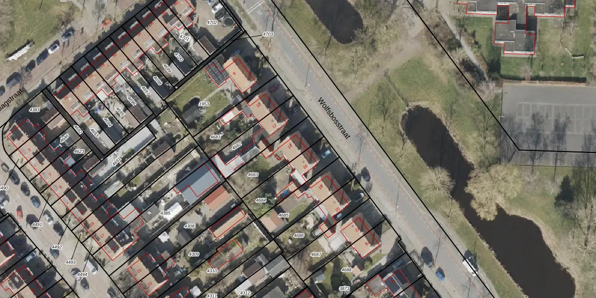 Wolfsbosstraat 14 is gelegen op kadastraal perceel HGV00I4683. Deze kadastrale aanduiding is uniek en wordt gebruikt door het Kadaster om eigendomsrechten en andere zakelijke rechten vast te leggen. Het perceel maakt onderdeel uit van de kadastrale gemeente Hoogeveen.