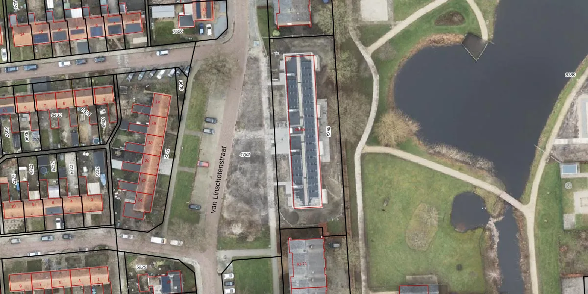 Het perceel waarop van Linschotenstraat 33 staat heeft een oppervlakte van 1447 m². Dit is een zeer groot perceel. De perceeloppervlakte wordt geregistreerd door het Kadaster. Gedetailleerde informatie over de maten van dit perceel kunt u vinden in het rapport Kadastrale kaart met maatvoering van van Linschotenstraat 33.