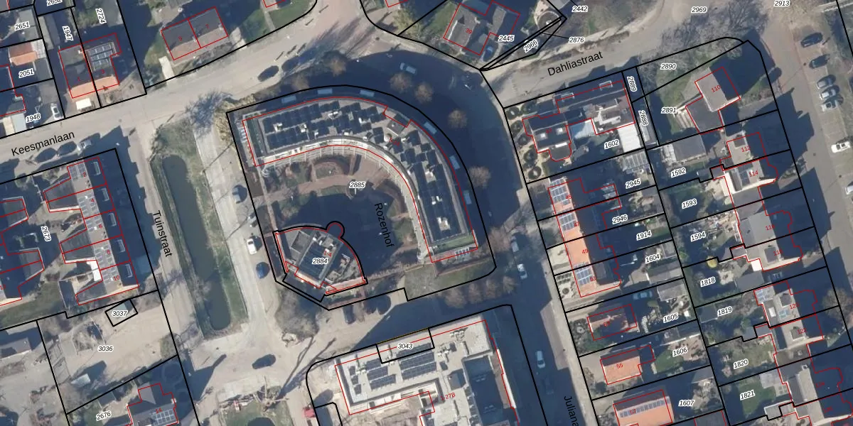 Het perceel waarop Rozenhof 9 staat heeft een oppervlakte van 2100 m². Dit is een zeer groot perceel. De perceeloppervlakte wordt geregistreerd door het Kadaster. Gedetailleerde informatie over de maten van dit perceel kunt u vinden in het rapport Kadastrale kaart met maatvoering van Rozenhof 9.