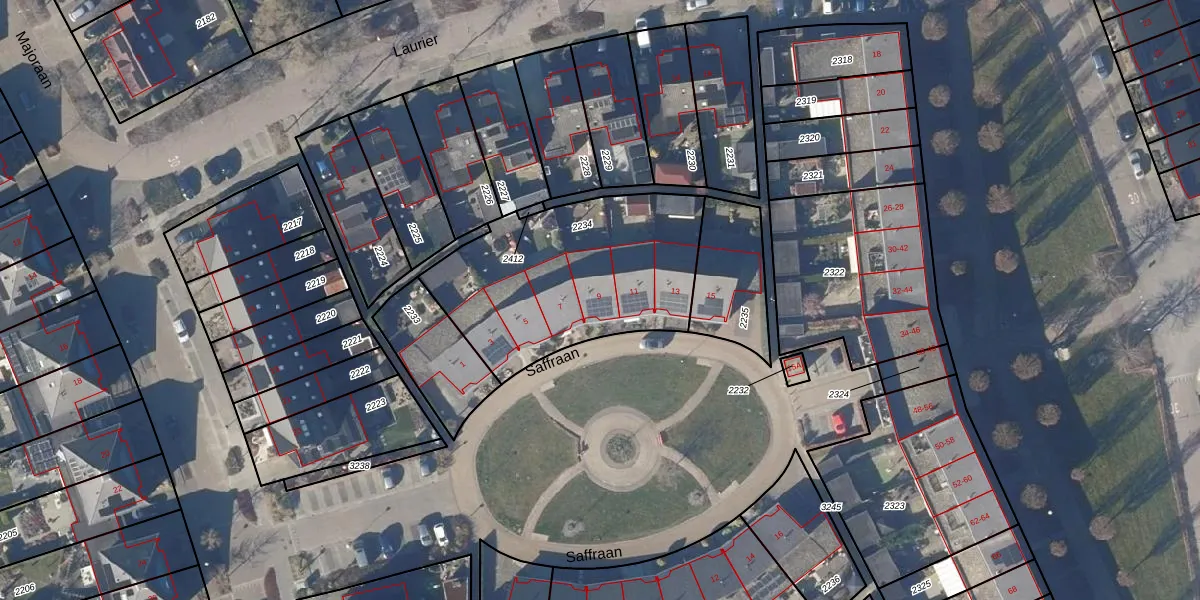 Het perceel waarop Saffraan 9 staat heeft een oppervlakte van 964 m². Dit is een groot perceel. De perceeloppervlakte wordt geregistreerd door het Kadaster. Gedetailleerde informatie over de maten van dit perceel kunt u vinden in het rapport Kadastrale kaart met maatvoering van Saffraan 9.