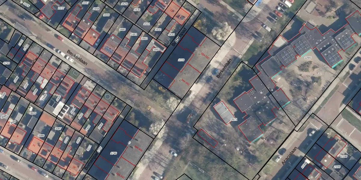 Het perceel waarop Berkenlaan 56-B staat heeft een oppervlakte van 734 m². Dit is een groot perceel. De perceeloppervlakte wordt geregistreerd door het Kadaster. Gedetailleerde informatie over de maten van dit perceel kunt u vinden in het rapport Kadastrale kaart met maatvoering van Berkenlaan 56-B.