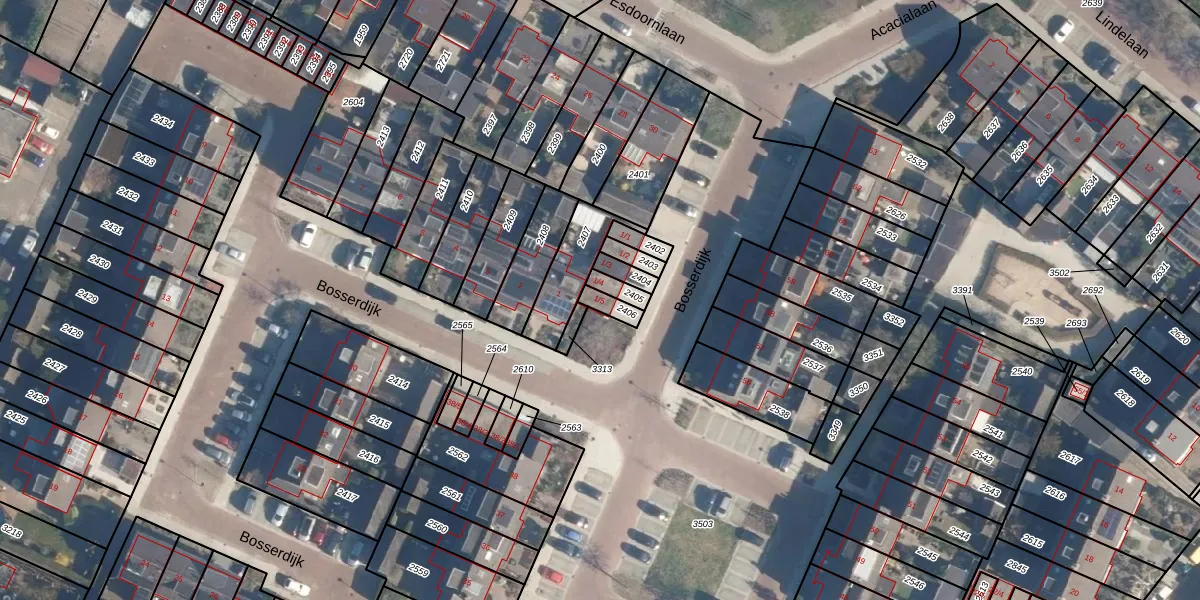 Het perceel waarop Bosserdijk 1-5 staat heeft een oppervlakte van 33 m². Dit is een klein perceel. De perceeloppervlakte wordt geregistreerd door het Kadaster. Gedetailleerde informatie over de maten van dit perceel kunt u vinden in het rapport Kadastrale kaart met maatvoering van Bosserdijk 1-5.