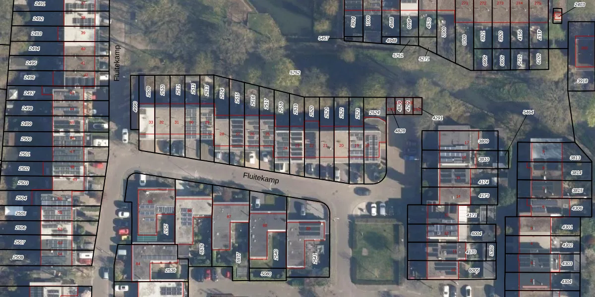Fluitekamp 23 is gelegen op kadastraal perceel HLD02E2519. Deze kadastrale aanduiding is uniek en wordt gebruikt door het Kadaster om eigendomsrechten en andere zakelijke rechten vast te leggen. Het perceel maakt onderdeel uit van de kadastrale gemeente Hoogland.