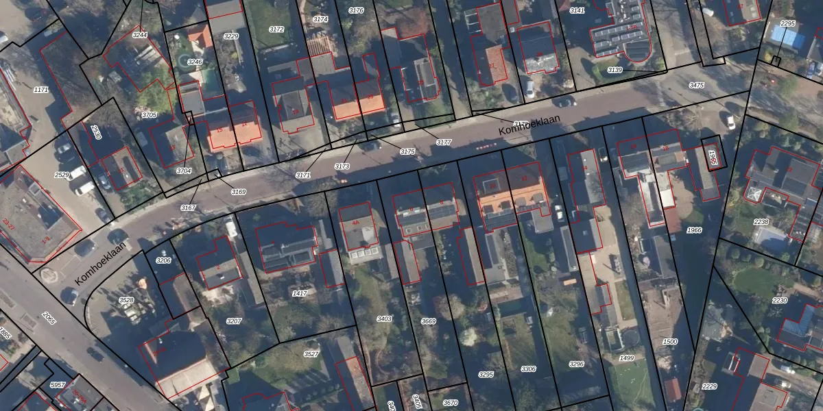 Komhoeklaan 6 is gelegen op kadastraal perceel HLD02D3669. Deze kadastrale aanduiding is uniek en wordt gebruikt door het Kadaster om eigendomsrechten en andere zakelijke rechten vast te leggen. Het perceel maakt onderdeel uit van de kadastrale gemeente Hoogland.