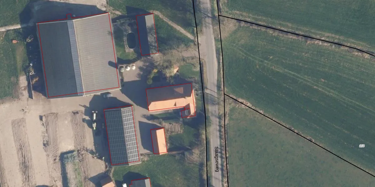 Het perceel waarop Slaagseweg 9-A staat heeft een oppervlakte van 10,6 ha. Dit is een zeer groot perceel. De perceeloppervlakte wordt geregistreerd door het Kadaster. Gedetailleerde informatie over de maten van dit perceel kunt u vinden in het rapport Kadastrale kaart met maatvoering van Slaagseweg 9-A.