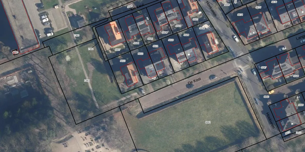 De Kooi 10 is gelegen op kadastraal perceel HLD02B5512. Deze kadastrale aanduiding is uniek en wordt gebruikt door het Kadaster om eigendomsrechten en andere zakelijke rechten vast te leggen. Het perceel maakt onderdeel uit van de kadastrale gemeente Hoogland.