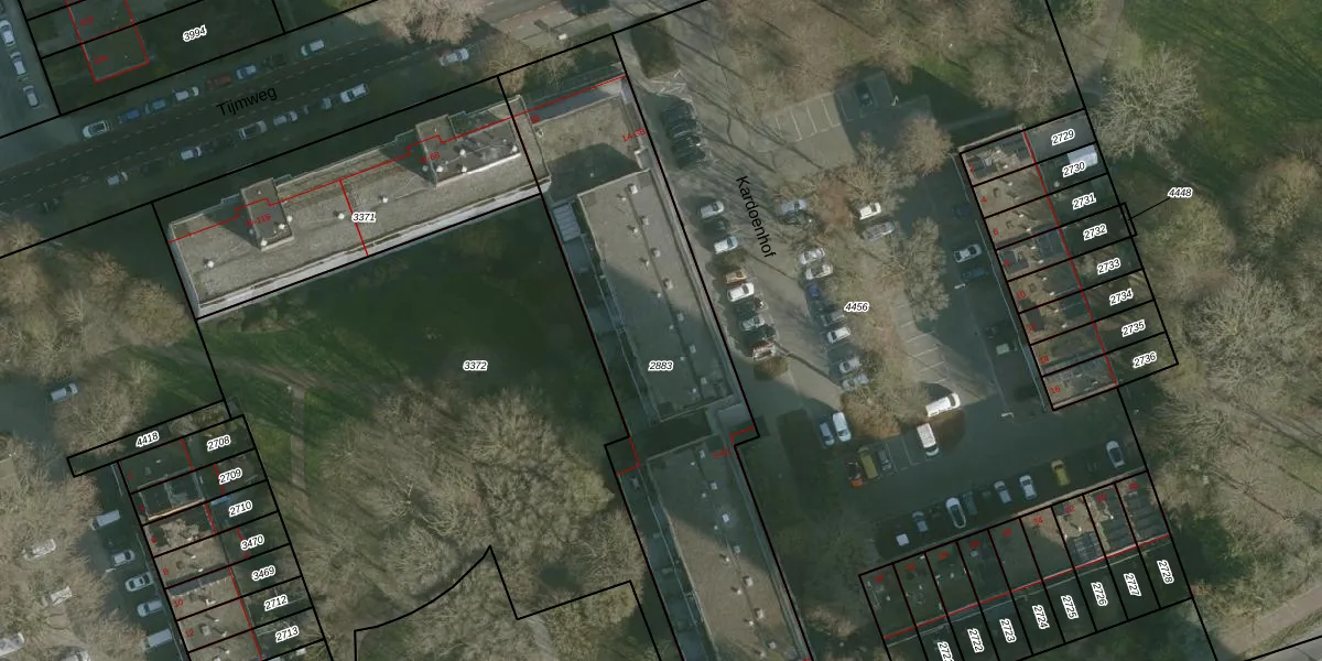Het perceel waarop Kardoenhof 25 staat heeft een oppervlakte van 1875 m². Dit is een zeer groot perceel. De perceeloppervlakte wordt geregistreerd door het Kadaster. Gedetailleerde informatie over de maten van dit perceel kunt u vinden in het rapport Kadastrale kaart met maatvoering van Kardoenhof 25.