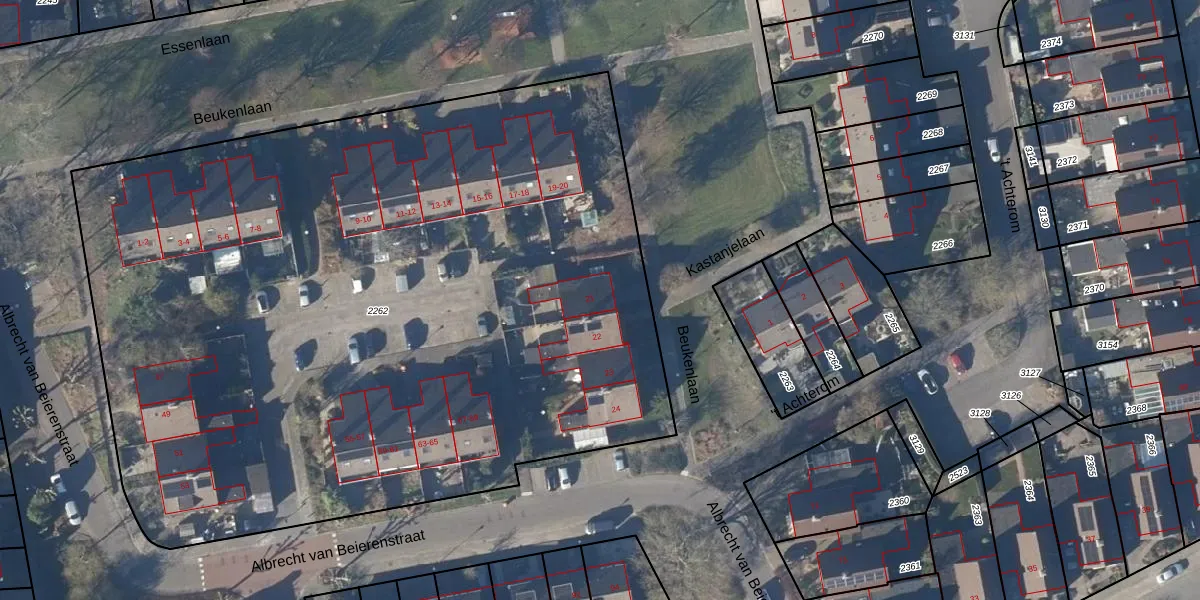 Het perceel waarop Beukenlaan 21 staat heeft een oppervlakte van 5881 m². Dit is een zeer groot perceel. De perceeloppervlakte wordt geregistreerd door het Kadaster. Gedetailleerde informatie over de maten van dit perceel kunt u vinden in het rapport Kadastrale kaart met maatvoering van Beukenlaan 21.