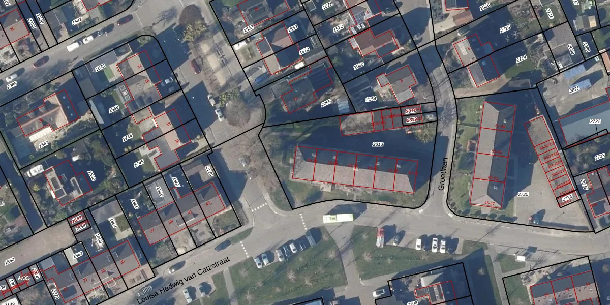Het perceel waarop Groetlaan 32 staat heeft een oppervlakte van 1490 m². Dit is een zeer groot perceel. De perceeloppervlakte wordt geregistreerd door het Kadaster. Gedetailleerde informatie over de maten van dit perceel kunt u vinden in het rapport Kadastrale kaart met maatvoering van Groetlaan 32.