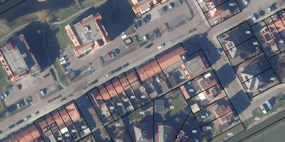 Het perceel waarop Oeverwal 54 staat heeft een oppervlakte van 3,8 ha. Dit is een zeer groot perceel. De perceeloppervlakte wordt geregistreerd door het Kadaster. Gedetailleerde informatie over de maten van dit perceel kunt u vinden in het rapport Kadastrale kaart met maatvoering van Oeverwal 54.