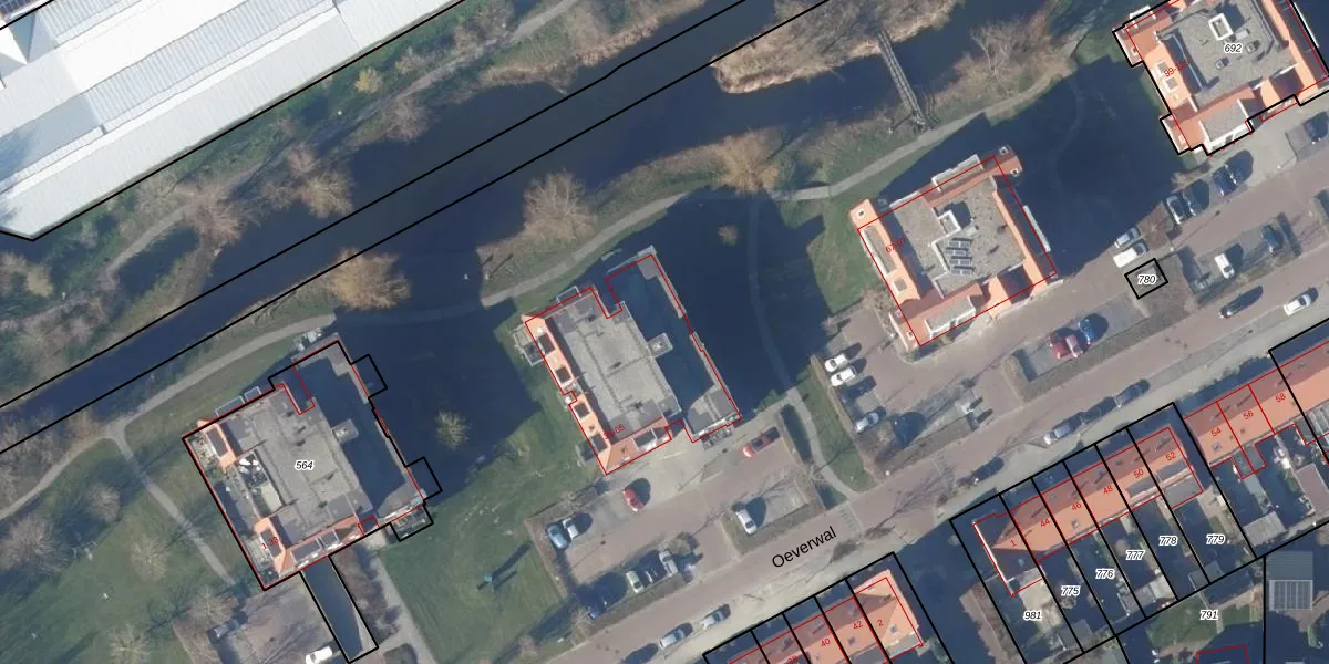 Het perceel waarop Oeverwal 65 staat heeft een oppervlakte van 3,8 ha. Dit is een zeer groot perceel. De perceeloppervlakte wordt geregistreerd door het Kadaster. Gedetailleerde informatie over de maten van dit perceel kunt u vinden in het rapport Kadastrale kaart met maatvoering van Oeverwal 65.