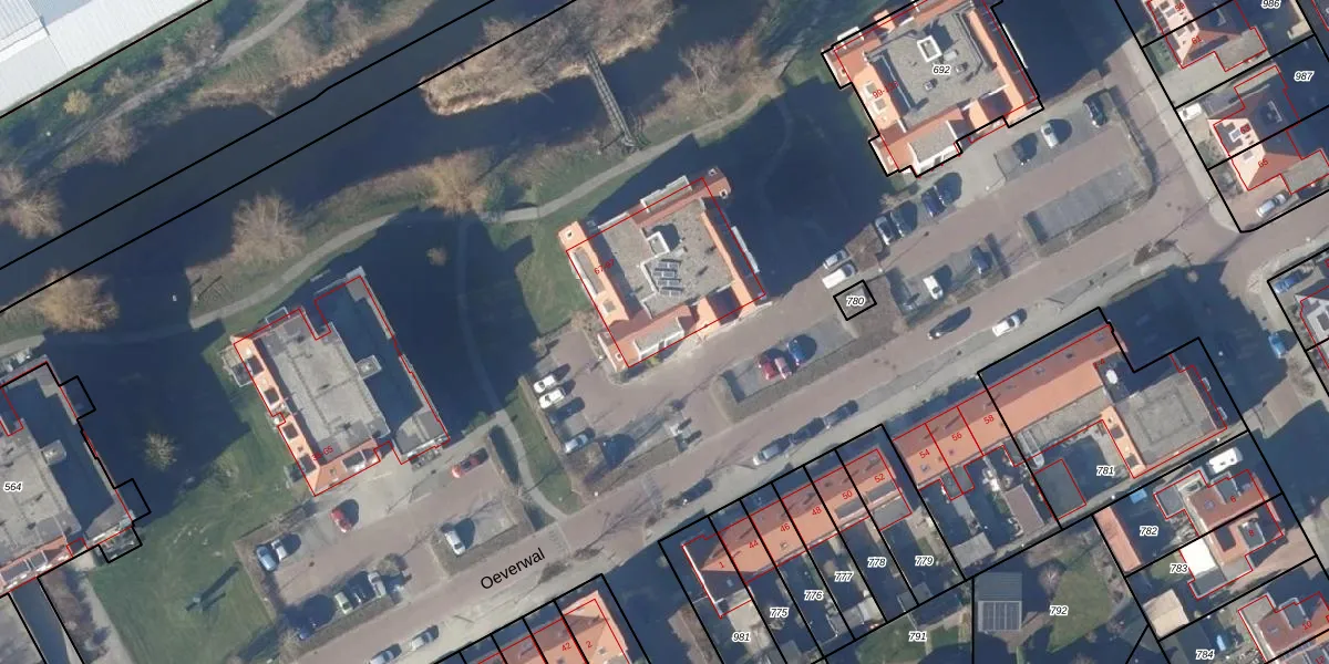 Het perceel waarop Oeverwal 69 staat heeft een oppervlakte van 3,8 ha. Dit is een zeer groot perceel. De perceeloppervlakte wordt geregistreerd door het Kadaster. Gedetailleerde informatie over de maten van dit perceel kunt u vinden in het rapport Kadastrale kaart met maatvoering van Oeverwal 69.