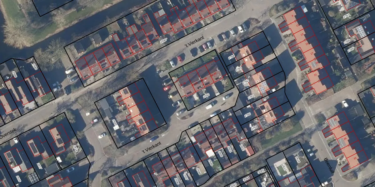 Het perceel waarop 't Vierkant 28 staat heeft een oppervlakte van 635 m². Dit is een groot perceel. De perceeloppervlakte wordt geregistreerd door het Kadaster. Gedetailleerde informatie over de maten van dit perceel kunt u vinden in het rapport Kadastrale kaart met maatvoering van 't Vierkant 28.