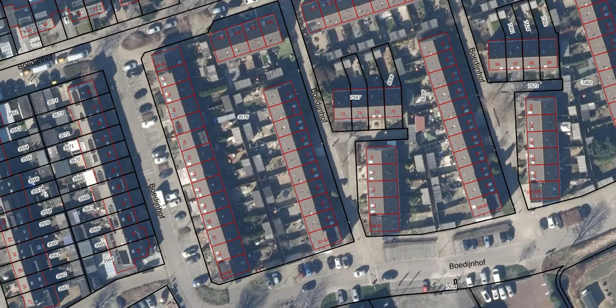 Het perceel waarop Boedijnhof 67 staat heeft een oppervlakte van 3868 m². Dit is een zeer groot perceel. De perceeloppervlakte wordt geregistreerd door het Kadaster. Gedetailleerde informatie over de maten van dit perceel kunt u vinden in het rapport Kadastrale kaart met maatvoering van Boedijnhof 67.
