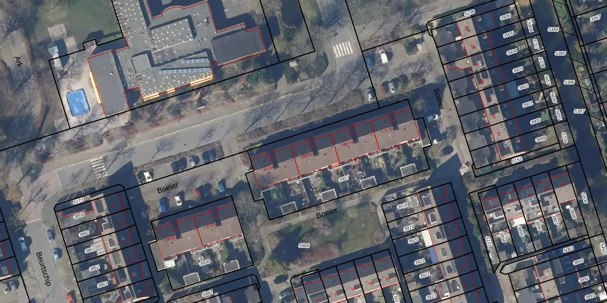 Het perceel waarop Boeier 65 staat heeft een oppervlakte van 1387 m². Dit is een zeer groot perceel. De perceeloppervlakte wordt geregistreerd door het Kadaster. Gedetailleerde informatie over de maten van dit perceel kunt u vinden in het rapport Kadastrale kaart met maatvoering van Boeier 65.