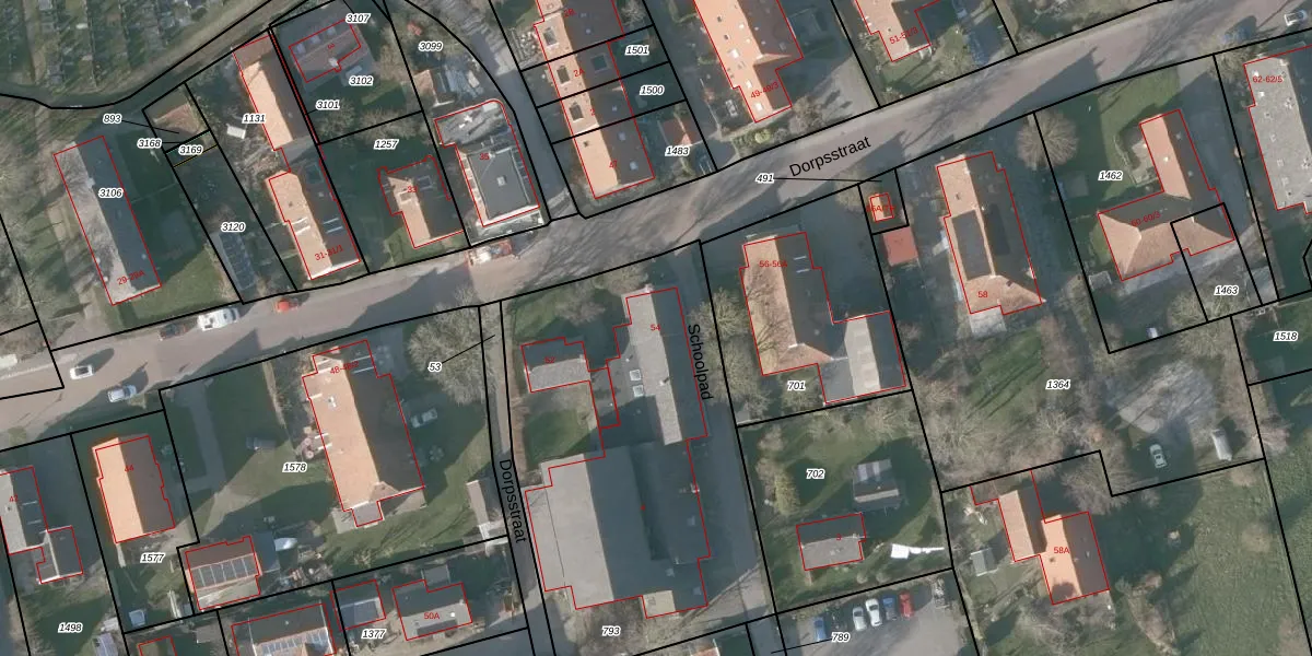 Het perceel waarop Dorpsstraat 54 staat heeft een oppervlakte van 1965 m². Dit is een zeer groot perceel. De perceeloppervlakte wordt geregistreerd door het Kadaster. Gedetailleerde informatie over de maten van dit perceel kunt u vinden in het rapport Kadastrale kaart met maatvoering van Dorpsstraat 54.