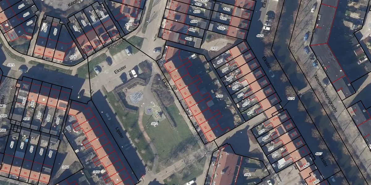 Ekster 19 is gelegen op kadastraal perceel HOO00L4266. Deze kadastrale aanduiding is uniek en wordt gebruikt door het Kadaster om eigendomsrechten en andere zakelijke rechten vast te leggen. Het perceel maakt onderdeel uit van de kadastrale gemeente Hoorn.