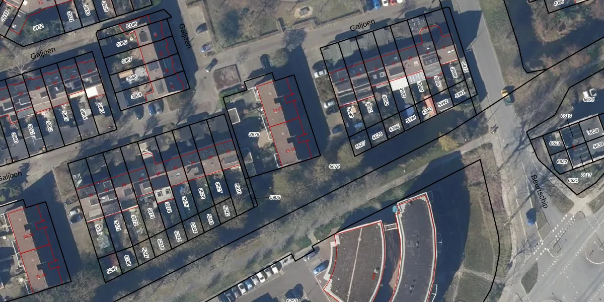 Het perceel waarop Galjoen 15 staat heeft een oppervlakte van 723 m². Dit is een groot perceel. De perceeloppervlakte wordt geregistreerd door het Kadaster. Gedetailleerde informatie over de maten van dit perceel kunt u vinden in het rapport Kadastrale kaart met maatvoering van Galjoen 15.