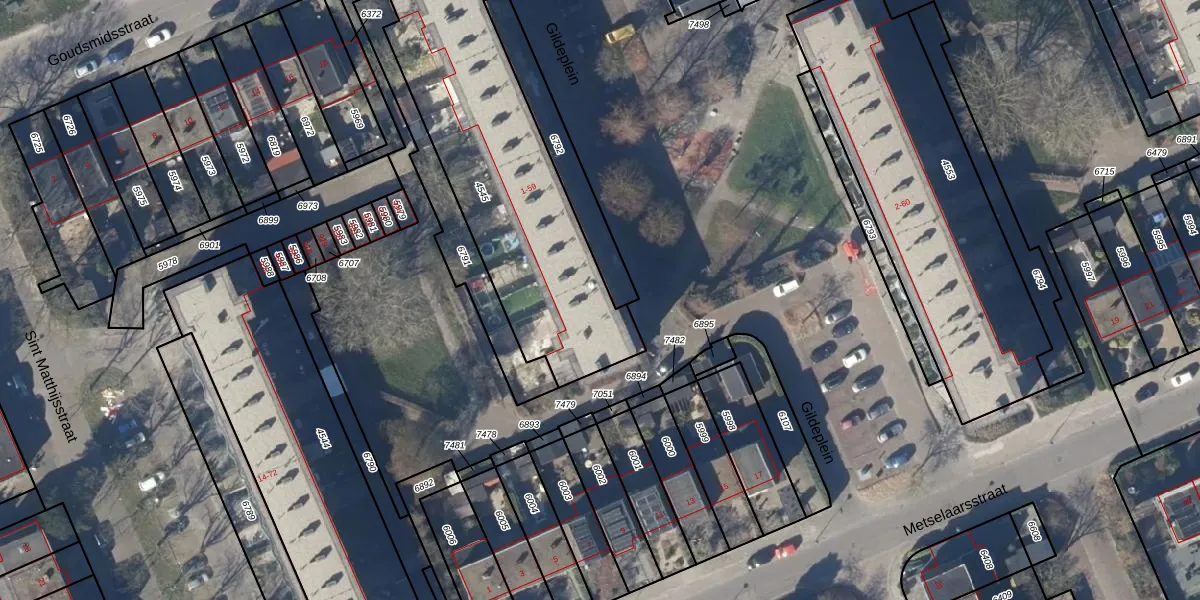 Het perceel waarop Gildeplein 1 staat heeft een oppervlakte van 1247 m². Dit is een zeer groot perceel. De perceeloppervlakte wordt geregistreerd door het Kadaster. Gedetailleerde informatie over de maten van dit perceel kunt u vinden in het rapport Kadastrale kaart met maatvoering van Gildeplein 1.