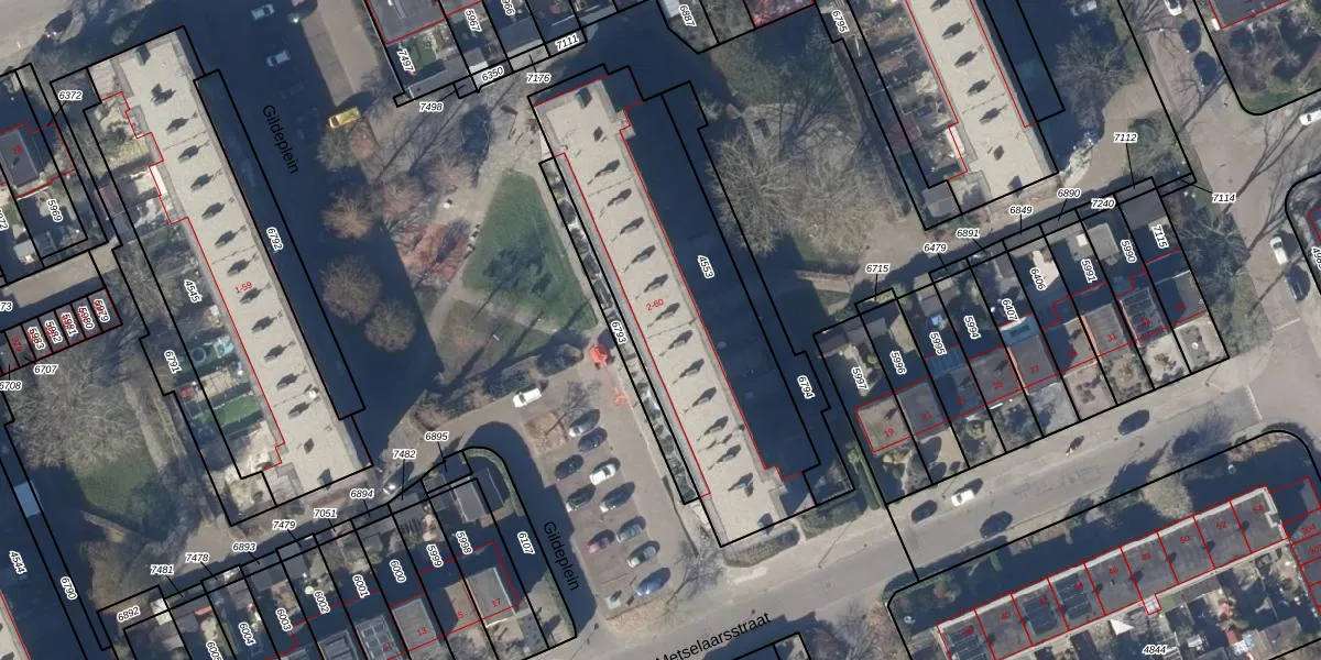 Het perceel waarop Gildeplein 12 staat heeft een oppervlakte van 1337 m². Dit is een zeer groot perceel. De perceeloppervlakte wordt geregistreerd door het Kadaster. Gedetailleerde informatie over de maten van dit perceel kunt u vinden in het rapport Kadastrale kaart met maatvoering van Gildeplein 12.