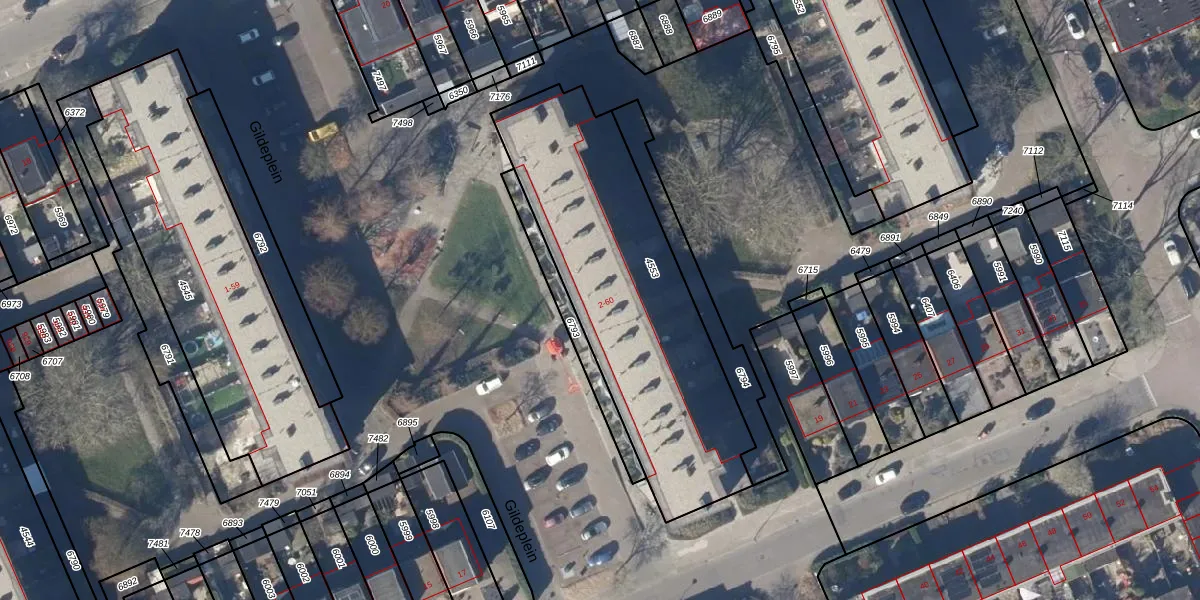 Het perceel waarop Gildeplein 14 staat heeft een oppervlakte van 1337 m². Dit is een zeer groot perceel. De perceeloppervlakte wordt geregistreerd door het Kadaster. Gedetailleerde informatie over de maten van dit perceel kunt u vinden in het rapport Kadastrale kaart met maatvoering van Gildeplein 14.