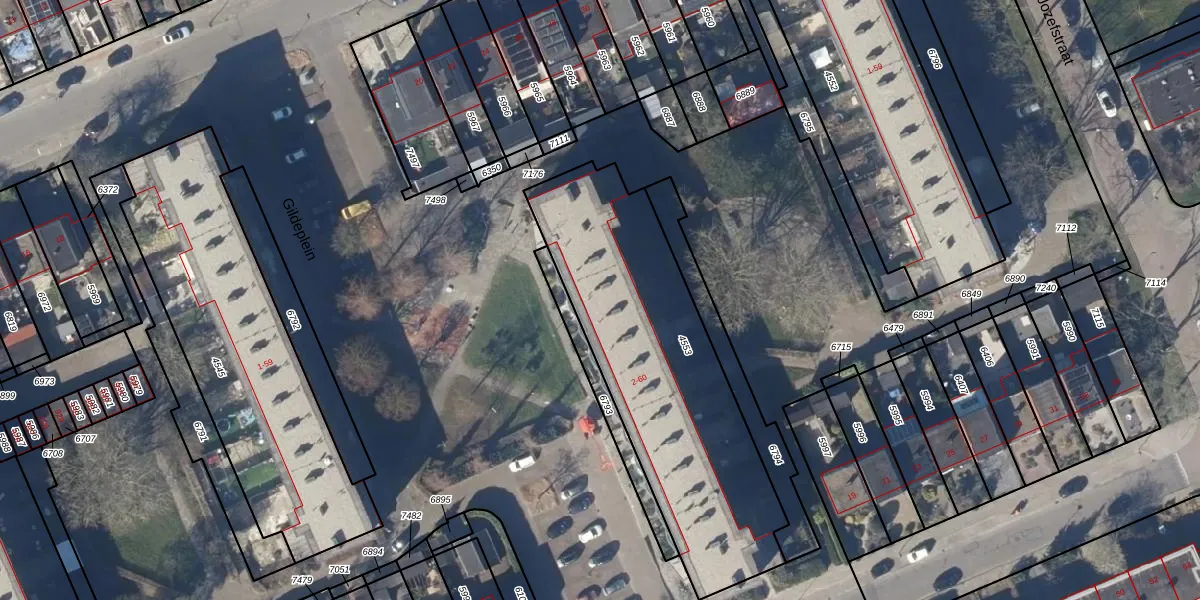 Het perceel waarop Gildeplein 20 staat heeft een oppervlakte van 1337 m². Dit is een zeer groot perceel. De perceeloppervlakte wordt geregistreerd door het Kadaster. Gedetailleerde informatie over de maten van dit perceel kunt u vinden in het rapport Kadastrale kaart met maatvoering van Gildeplein 20.