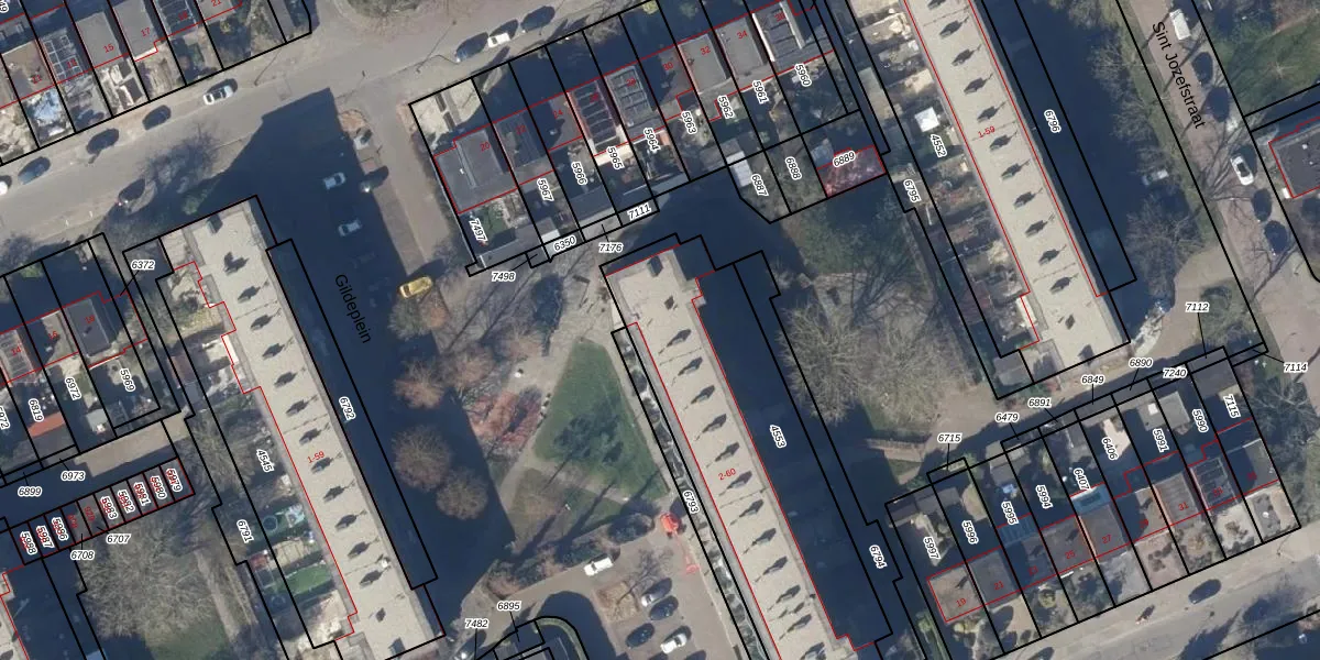Het perceel waarop Gildeplein 24 staat heeft een oppervlakte van 1337 m². Dit is een zeer groot perceel. De perceeloppervlakte wordt geregistreerd door het Kadaster. Gedetailleerde informatie over de maten van dit perceel kunt u vinden in het rapport Kadastrale kaart met maatvoering van Gildeplein 24.