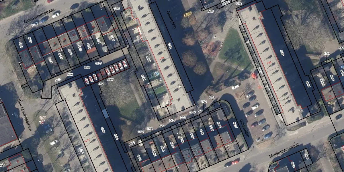Het perceel waarop Gildeplein 33 staat heeft een oppervlakte van 1247 m². Dit is een zeer groot perceel. De perceeloppervlakte wordt geregistreerd door het Kadaster. Gedetailleerde informatie over de maten van dit perceel kunt u vinden in het rapport Kadastrale kaart met maatvoering van Gildeplein 33.
