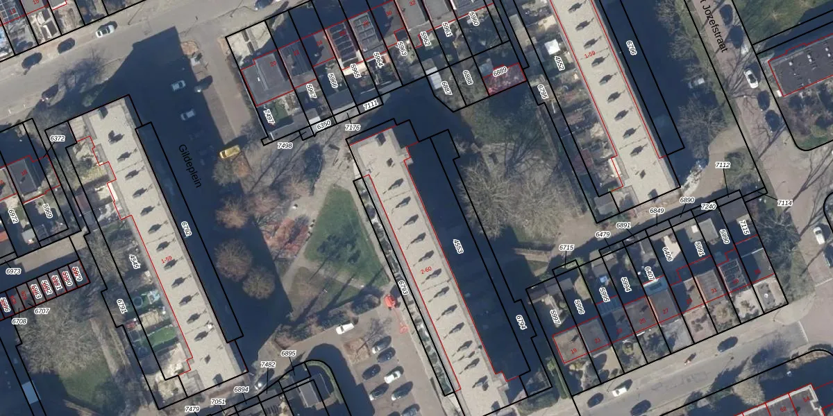 Het perceel waarop Gildeplein 50 staat heeft een oppervlakte van 1337 m². Dit is een zeer groot perceel. De perceeloppervlakte wordt geregistreerd door het Kadaster. Gedetailleerde informatie over de maten van dit perceel kunt u vinden in het rapport Kadastrale kaart met maatvoering van Gildeplein 50.