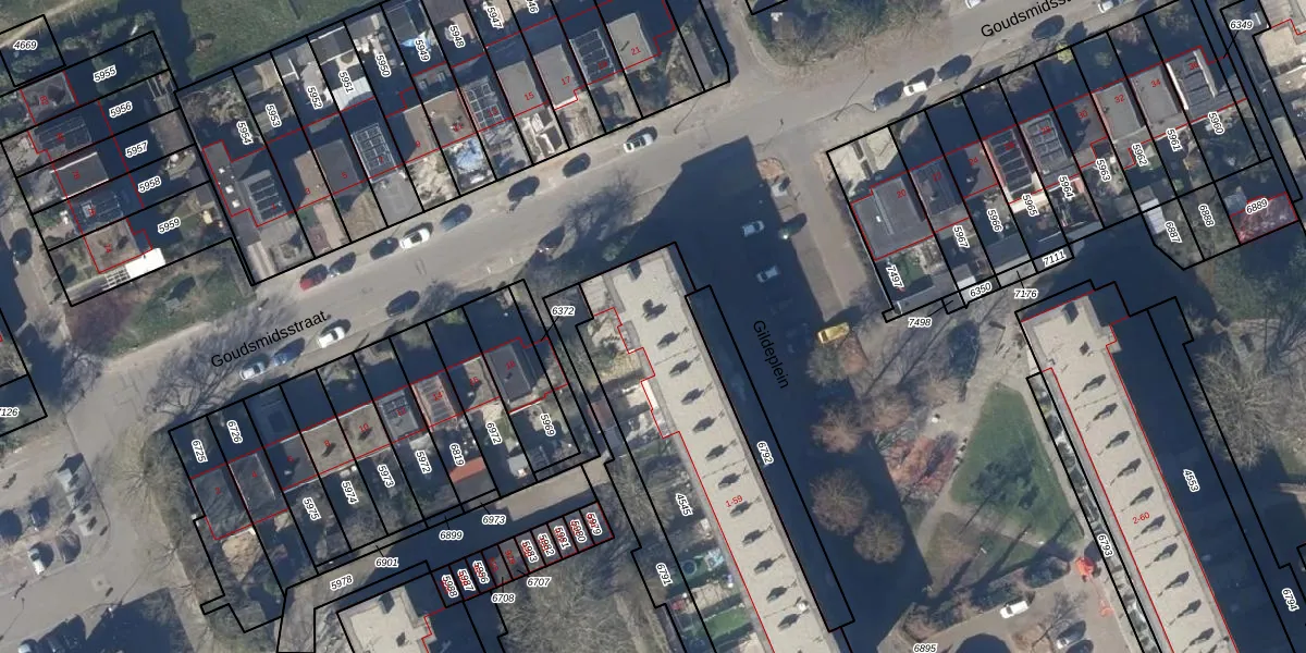 Het perceel waarop Gildeplein 53 staat heeft een oppervlakte van 1247 m². Dit is een zeer groot perceel. De perceeloppervlakte wordt geregistreerd door het Kadaster. Gedetailleerde informatie over de maten van dit perceel kunt u vinden in het rapport Kadastrale kaart met maatvoering van Gildeplein 53.
