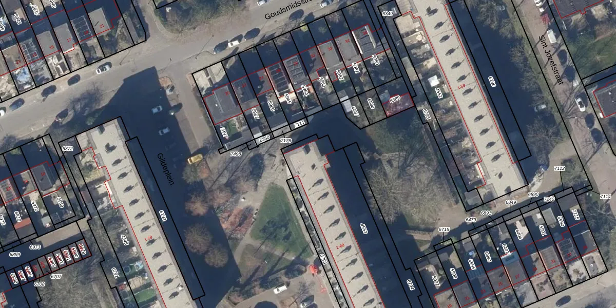 Het perceel waarop Gildeplein 56 staat heeft een oppervlakte van 1337 m². Dit is een zeer groot perceel. De perceeloppervlakte wordt geregistreerd door het Kadaster. Gedetailleerde informatie over de maten van dit perceel kunt u vinden in het rapport Kadastrale kaart met maatvoering van Gildeplein 56.