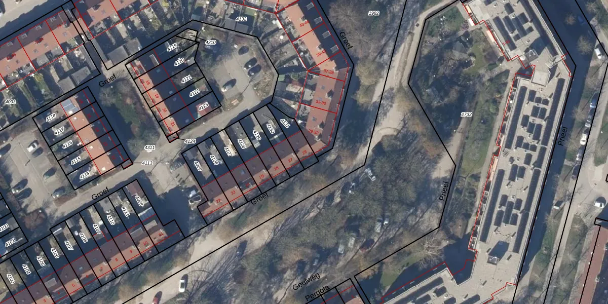 Het perceel waarop Groef 28 staat heeft een oppervlakte van 112 m². Dit is een middelgroot perceel. De perceeloppervlakte wordt geregistreerd door het Kadaster. Gedetailleerde informatie over de maten van dit perceel kunt u vinden in het rapport Kadastrale kaart met maatvoering van Groef 28.