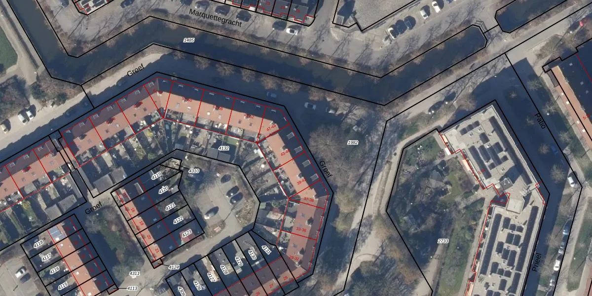 Het perceel waarop Groef 43 staat heeft een oppervlakte van 2757 m². Dit is een zeer groot perceel. De perceeloppervlakte wordt geregistreerd door het Kadaster. Gedetailleerde informatie over de maten van dit perceel kunt u vinden in het rapport Kadastrale kaart met maatvoering van Groef 43.