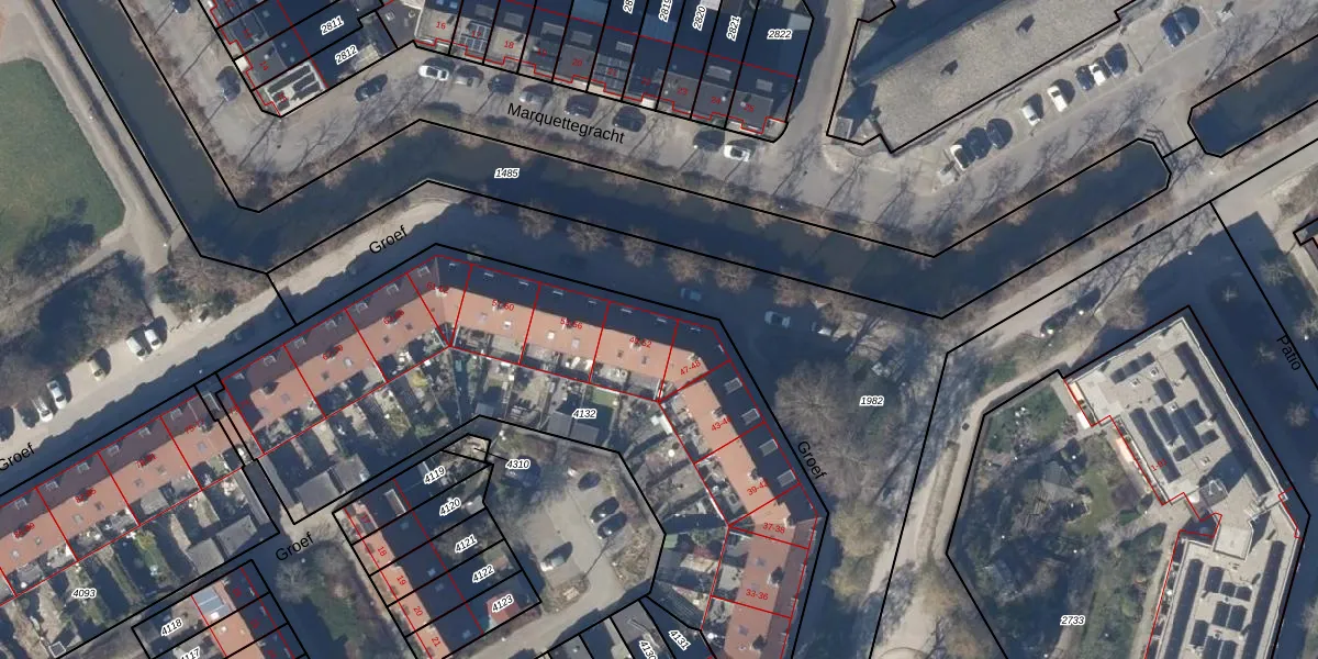 Het perceel waarop Groef 49 staat heeft een oppervlakte van 2757 m². Dit is een zeer groot perceel. De perceeloppervlakte wordt geregistreerd door het Kadaster. Gedetailleerde informatie over de maten van dit perceel kunt u vinden in het rapport Kadastrale kaart met maatvoering van Groef 49.