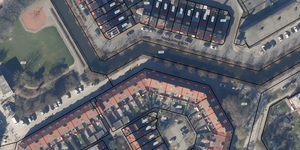 Het perceel waarop Groef 61 staat heeft een oppervlakte van 2757 m². Dit is een zeer groot perceel. De perceeloppervlakte wordt geregistreerd door het Kadaster. Gedetailleerde informatie over de maten van dit perceel kunt u vinden in het rapport Kadastrale kaart met maatvoering van Groef 61.