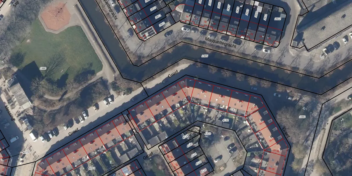 Het perceel waarop Groef 63 staat heeft een oppervlakte van 2757 m². Dit is een zeer groot perceel. De perceeloppervlakte wordt geregistreerd door het Kadaster. Gedetailleerde informatie over de maten van dit perceel kunt u vinden in het rapport Kadastrale kaart met maatvoering van Groef 63.