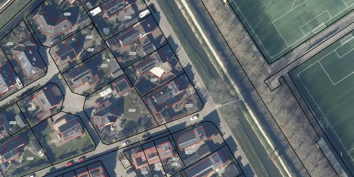 Het perceel waarop Groene Steen 53 staat heeft een oppervlakte van 597 m². Dit is een groot perceel. De perceeloppervlakte wordt geregistreerd door het Kadaster. Gedetailleerde informatie over de maten van dit perceel kunt u vinden in het rapport Kadastrale kaart met maatvoering van Groene Steen 53.