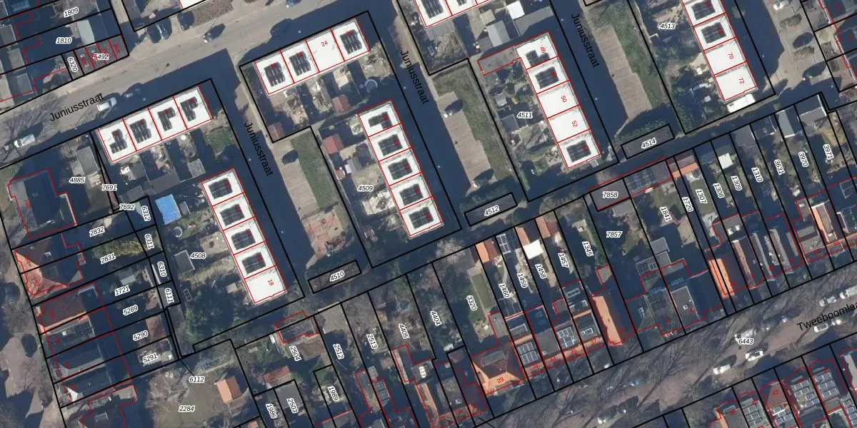 Het perceel waarop Juniusstraat 36 staat heeft een oppervlakte van 1458 m². Dit is een zeer groot perceel. De perceeloppervlakte wordt geregistreerd door het Kadaster. Gedetailleerde informatie over de maten van dit perceel kunt u vinden in het rapport Kadastrale kaart met maatvoering van Juniusstraat 36.