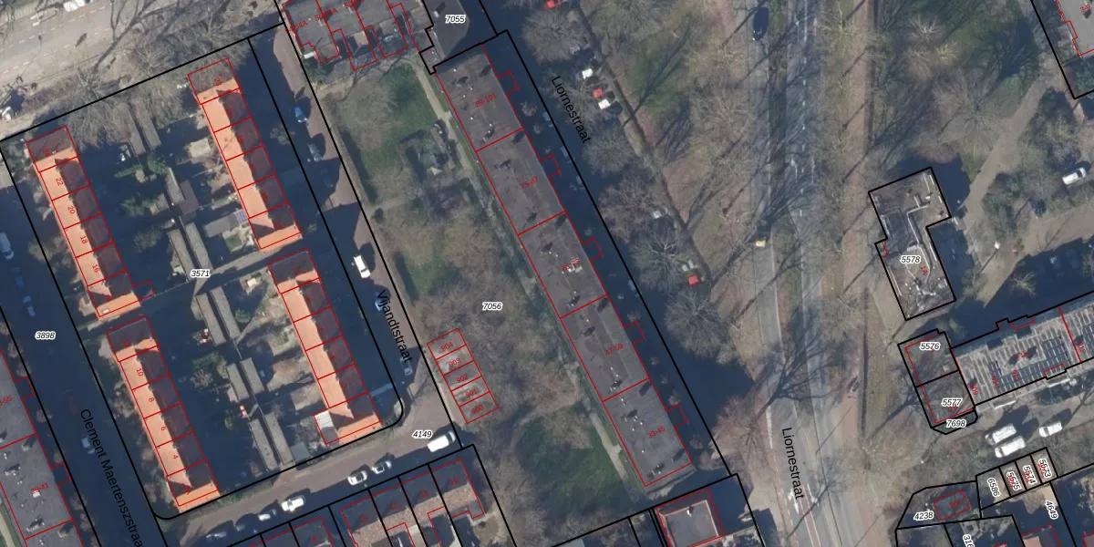 Het perceel waarop Liornestraat 71 staat heeft een oppervlakte van 4158 m². Dit is een zeer groot perceel. De perceeloppervlakte wordt geregistreerd door het Kadaster. Gedetailleerde informatie over de maten van dit perceel kunt u vinden in het rapport Kadastrale kaart met maatvoering van Liornestraat 71.