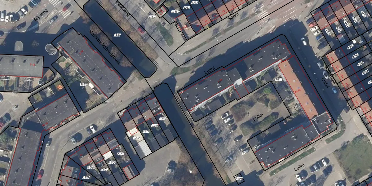 Het perceel waarop Luifel 1 staat heeft een oppervlakte van 2495 m². Dit is een zeer groot perceel. De perceeloppervlakte wordt geregistreerd door het Kadaster. Gedetailleerde informatie over de maten van dit perceel kunt u vinden in het rapport Kadastrale kaart met maatvoering van Luifel 1.