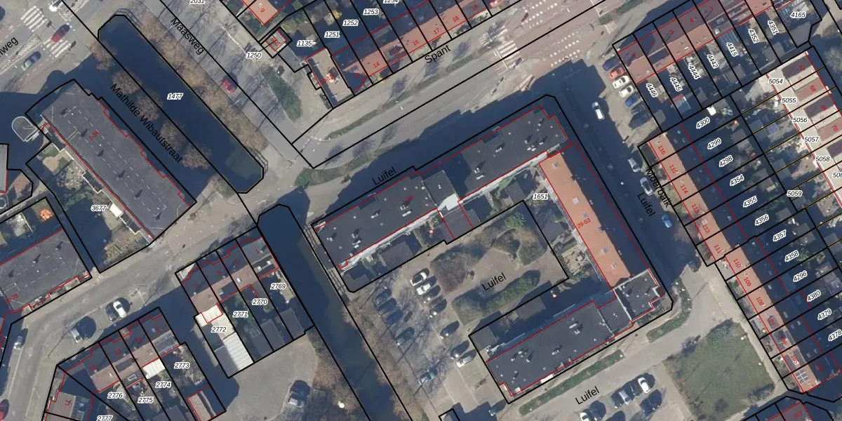 Het perceel waarop Luifel 28 staat heeft een oppervlakte van 2495 m². Dit is een zeer groot perceel. De perceeloppervlakte wordt geregistreerd door het Kadaster. Gedetailleerde informatie over de maten van dit perceel kunt u vinden in het rapport Kadastrale kaart met maatvoering van Luifel 28.